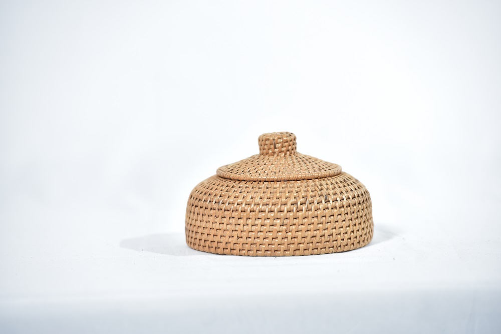 | BEKAS BERBENTUK GASING ANYAMAN RIBU-RIBU DILENGKAPI DENGAN SULAMAN LILITAN MANIK DI BAHAGIAN TEPI LUAR BEKAS. 2. DILENGKAPI DENGAN PENUTUP DI BAHAGIAN ATAS BEKAS.3.BEKAS BERWARNA NATURAL RIBU-RIBU. |