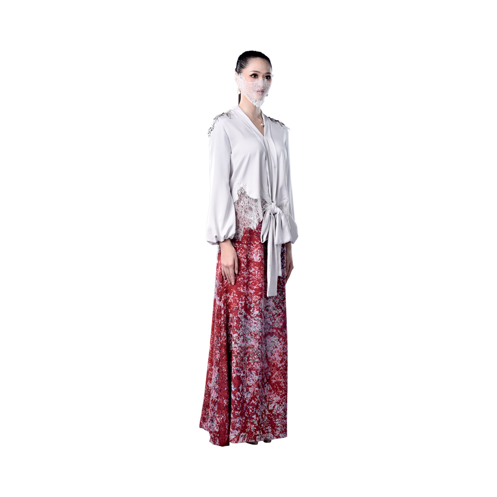The Alia modern kurung is a pairing of a flattering grey top with shoulder detailing and exquisite French lace trimming with a red clay batik skirt. Its simple, yet elegant enough to let your natural beauty shine through.