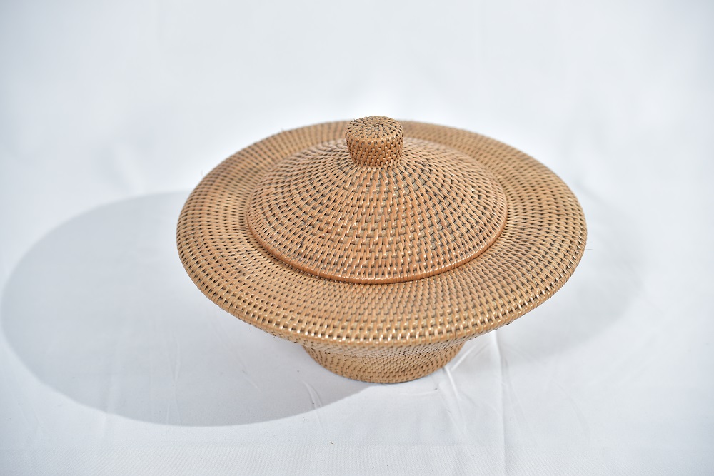 | BEKAS BERBENTUK GASING ANYAMAN RIBU-RIBU DILENGKAPI DENGAN SULAMAN LILITAN MANIK DI BAHAGIAN TEPI LUAR BEKAS. 2. DILENGKAPI DENGAN PENUTUP DI BAHAGIAN ATAS BEKAS.3.BEKAS BERWARNA NATURAL RIBU-RIBU. |