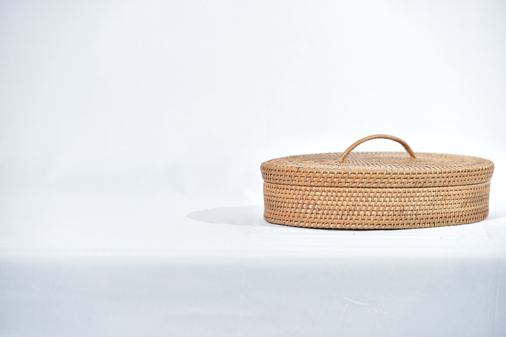 | 1.BEKAS SELAPA ANYAMAN RIBU-RIBU 2. BEKAS BERBENTUK BULAT DENGAN WARNA NATURAL RIBU-RIBU. 3. BEKAS YANG MEMPUNYAI PENUTUP. 4. DILENGKAPI DENGAN TANGKAI. |