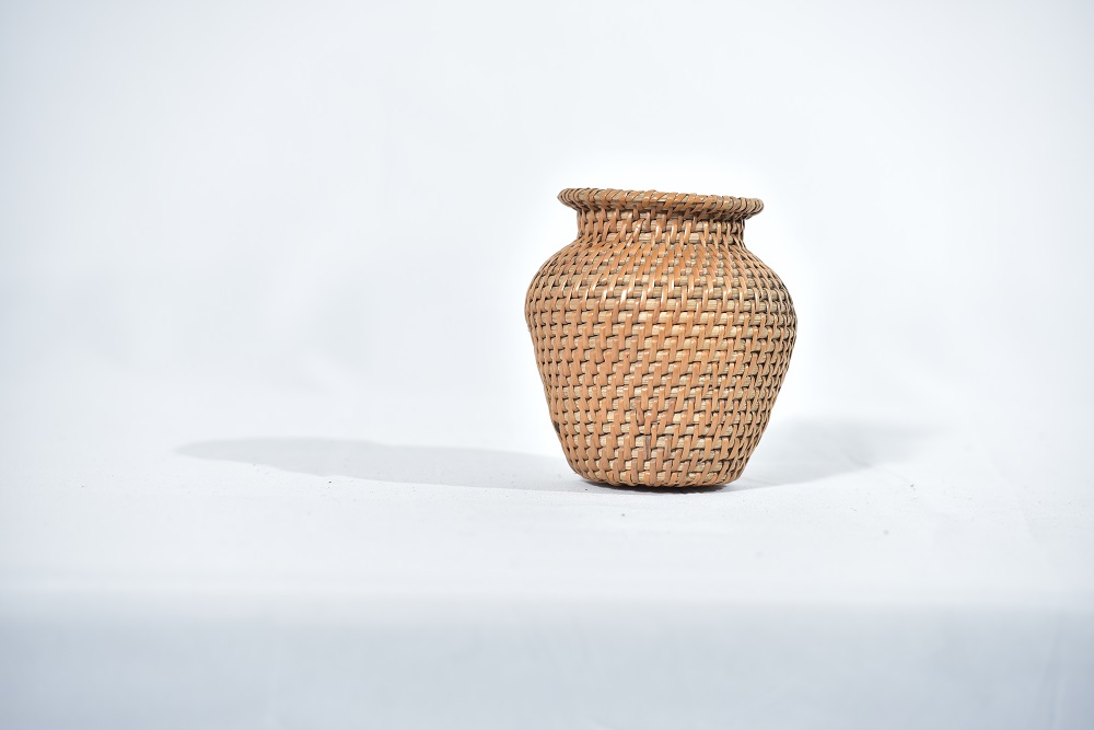 | BEKAS PASU PERHIASAN YANG DIPERBUAT DARI ANYAMAN RIBU-RIBU YANG MENAMPILKAN BENTUK MODEN DIGABUNGKAN DENGAN ANYAMAN TRADISIONAL. |