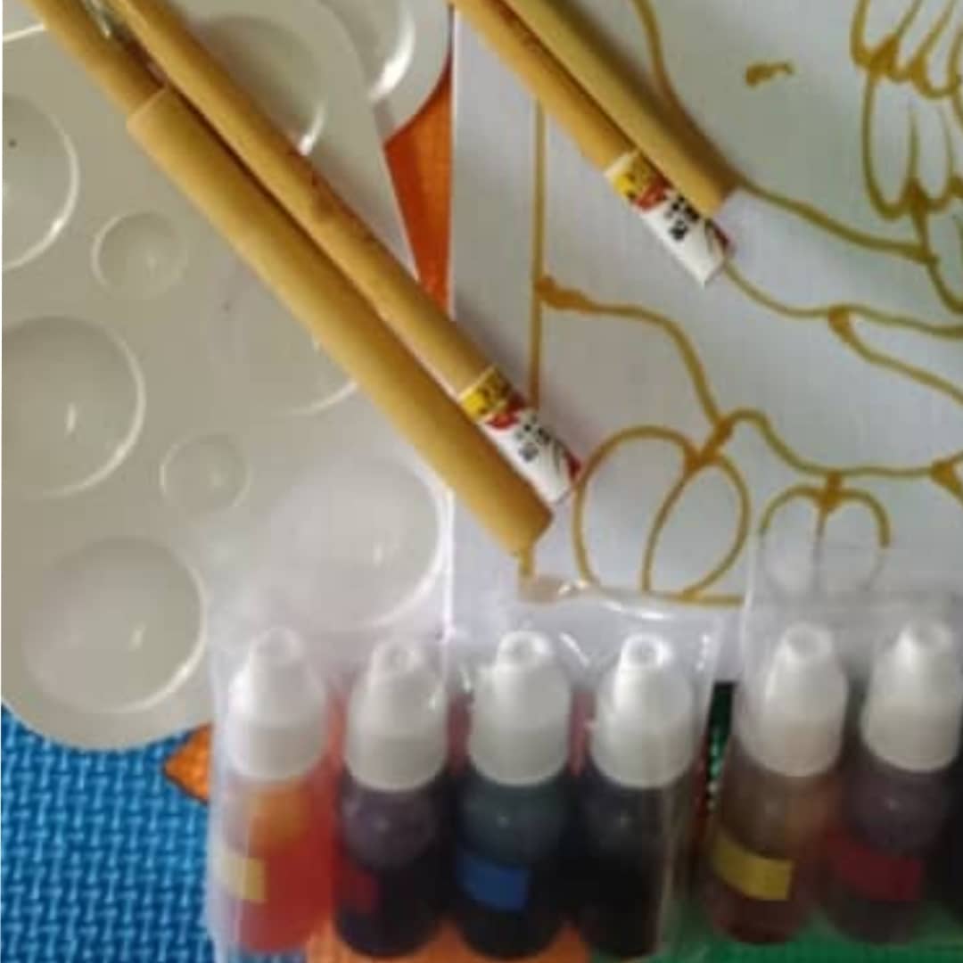 3) SETIAP KOTAK MENGANDUNGI / EVERY BOX CONTAIN : 01 HAND DRAWN UNCOLOURED BATIK PAINTING SIZED 09" x 09", 01 COLOUR PALLETE, 02 COLOUR BAMBOO BRUSH, 04 BOTTLES BATIK COLOUR (BLACK, BLUE, RED, YELLOW)