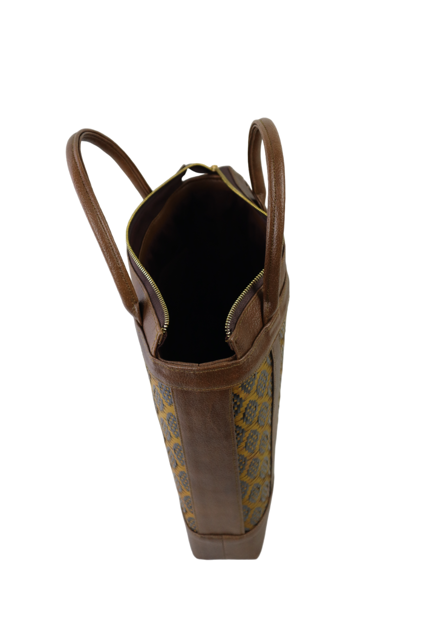 -BEG YANG DIPERBUAT MENGGUNAKAN ANYAMAN BULUH DAN PU LEATHER DENGAN BERMOTIFKAN CORAK ETNIK.