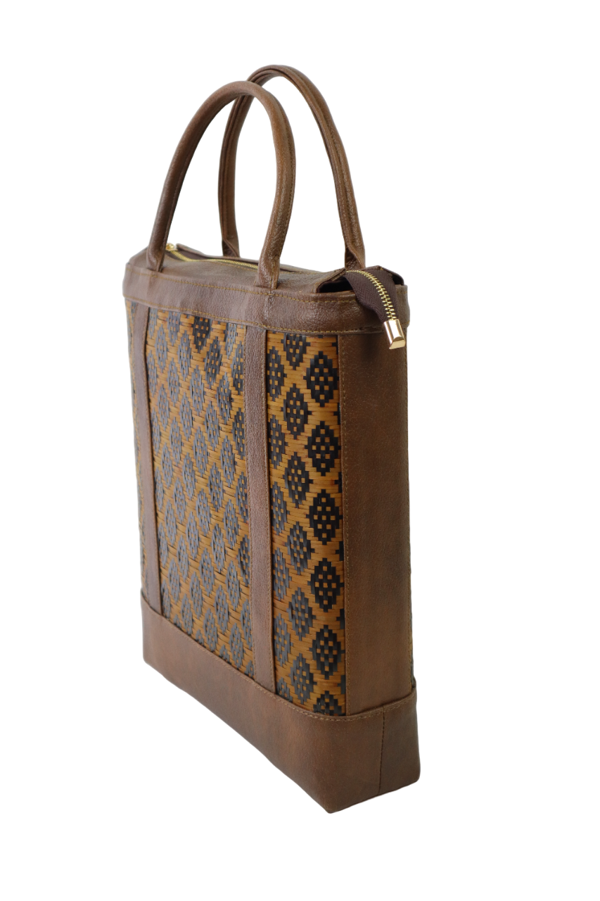 -BEG YANG DIPERBUAT MENGGUNAKAN ANYAMAN BULUH DAN PU LEATHER DENGAN BERMOTIFKAN CORAK ETNIK.