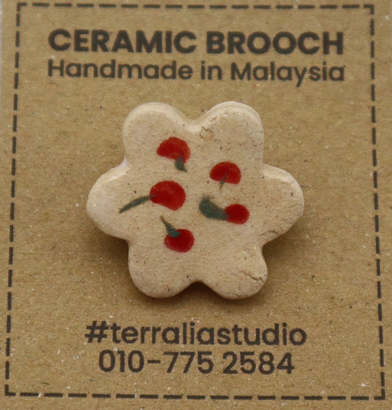 1-BAHAN DARI TANAH LIAT DIJADIKAN BROOCH BERBENTUK BUNGA DAN DIDATANGKAN DENGAN PIN.