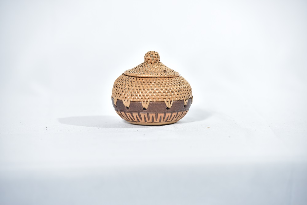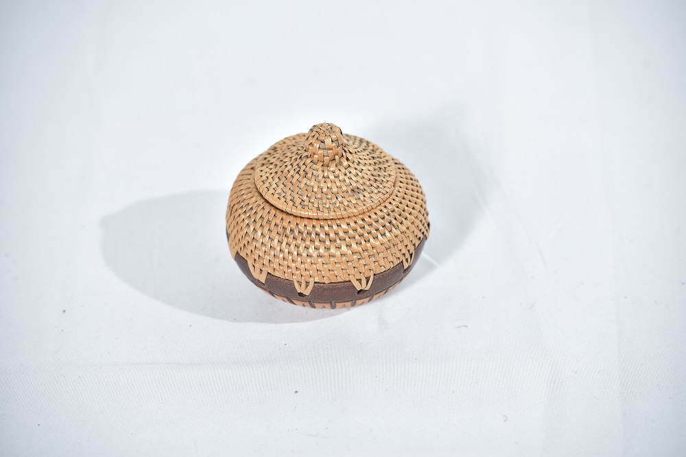 | BEKAS BERBENTUK GASING ANYAMAN RIBU-RIBU DILENGKAPI DENGAN SULAMAN LILITAN MANIK DI BAHAGIAN TEPI LUAR BEKAS. 2. DILENGKAPI DENGAN PENUTUP DI BAHAGIAN ATAS BEKAS.3.BEKAS BERWARNA NATURAL RIBU-RIBU. |