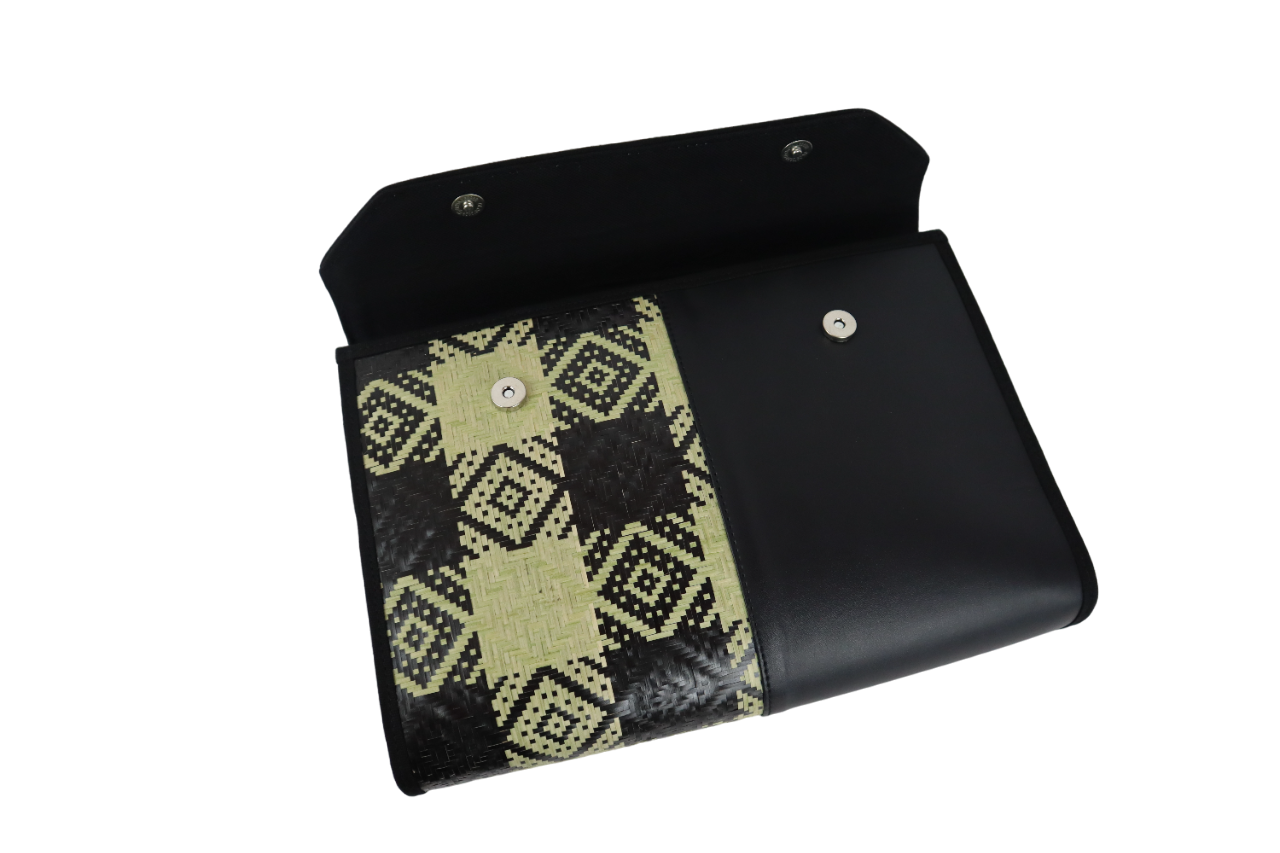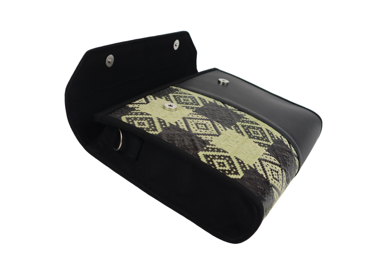 -DIPERBUAT DENGAN MENGGUNAKAN ANYAMAN BULUH DENGAN BERMOTIFKAN CORAK ETNIK.