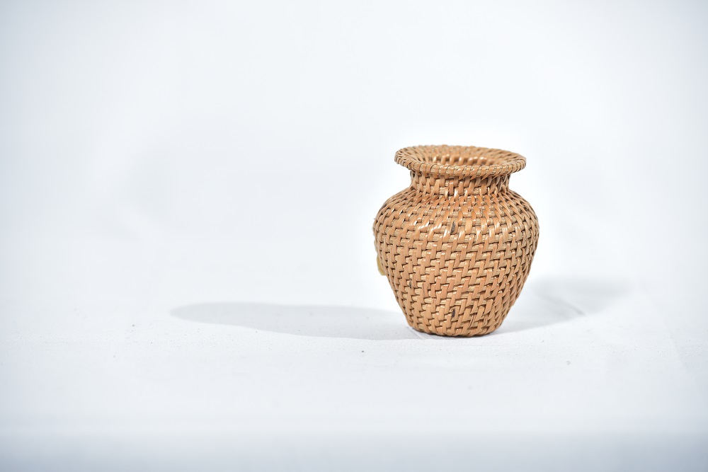 | BEKAS PASU PERHIASAN YANG DIPERBUAT DARI ANYAMAN RIBU-RIBU YANG MENAMPILKAN BENTUK MODEN DIGABUNGKAN DENGAN ANYAMAN TRADISIONAL. |